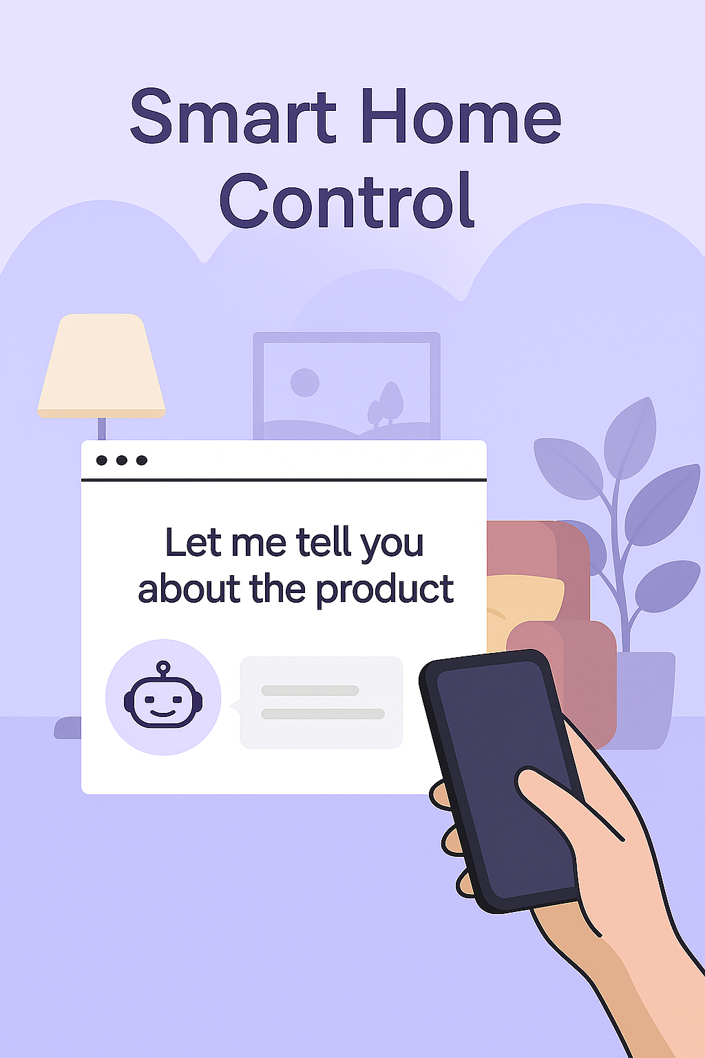 /Collection: , /by davooda/Type: PNG/Illustrative graphic showcasing a smart home control interface. The design features a hand holding a smartphone, emphasizing user interaction with technology in a cozy home setting.