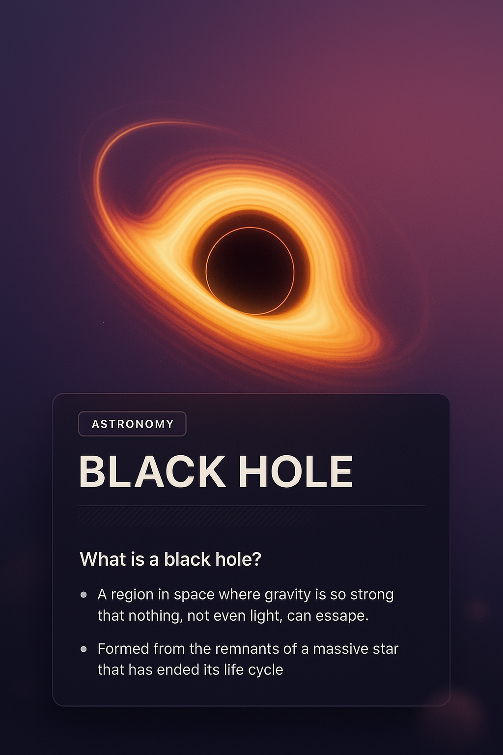 /Collection: /by davooda/Type: PNG/A captivating 3D visualization of a black hole, featuring a dark background with a glowing halo. The design includes an informative text block with a sleek layout and elegant typography.