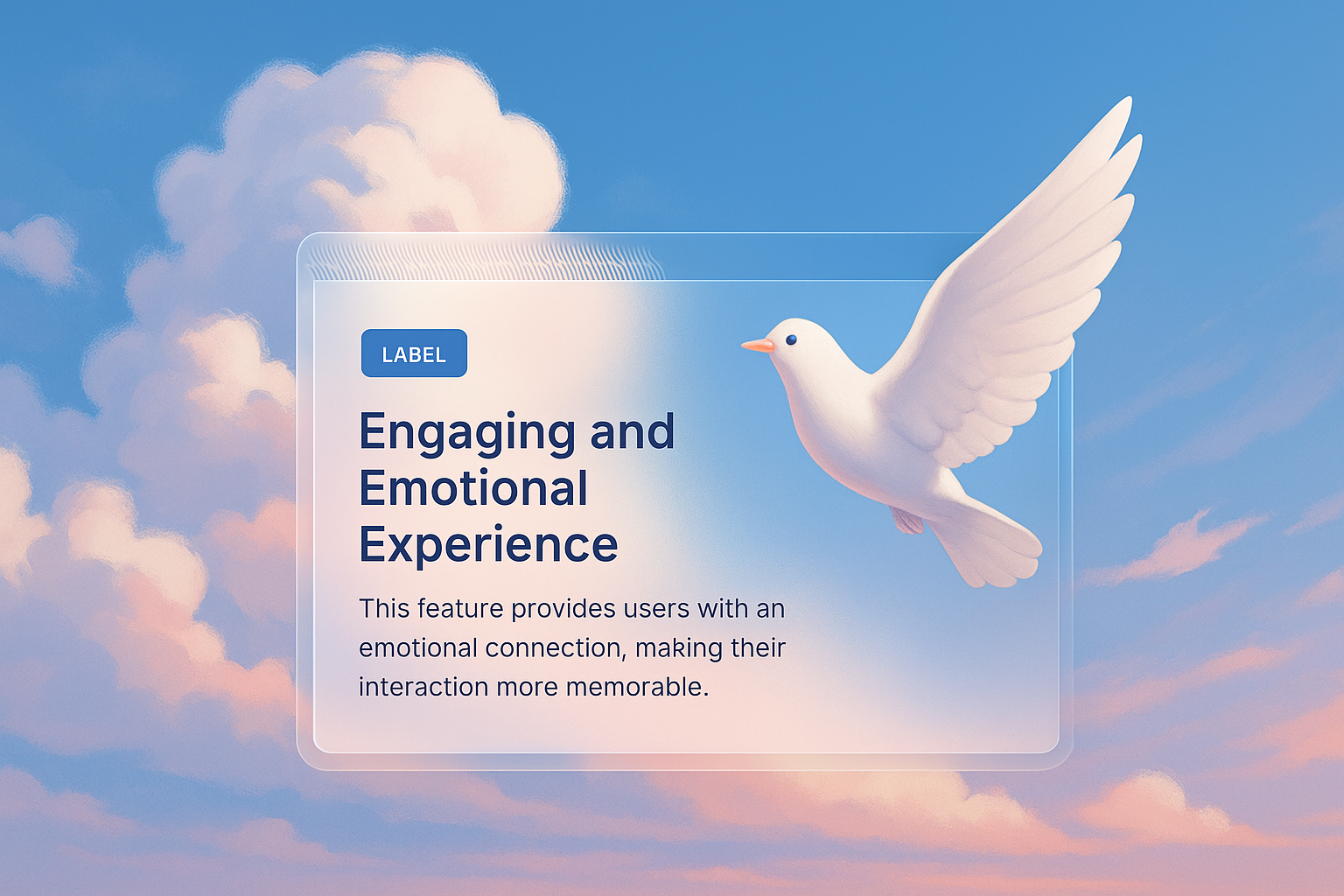 This painting features a white bird soaring through a soft blue sky adorned with fluffy clouds, complemented by a subtle text block that enhances the emotional connection.