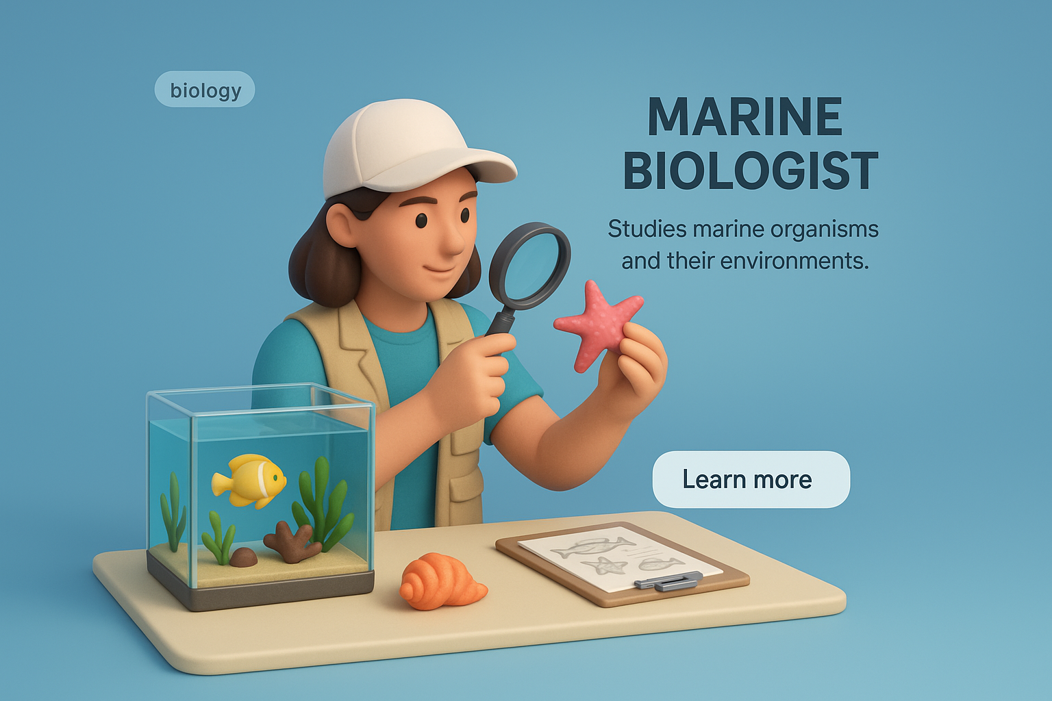 /Collection: /by davooda/Type: PNG/A detailed 3D illustration of a marine biologist studying sea life. The scene includes a biologist holding a starfish, with an aquarium and research materials in view.