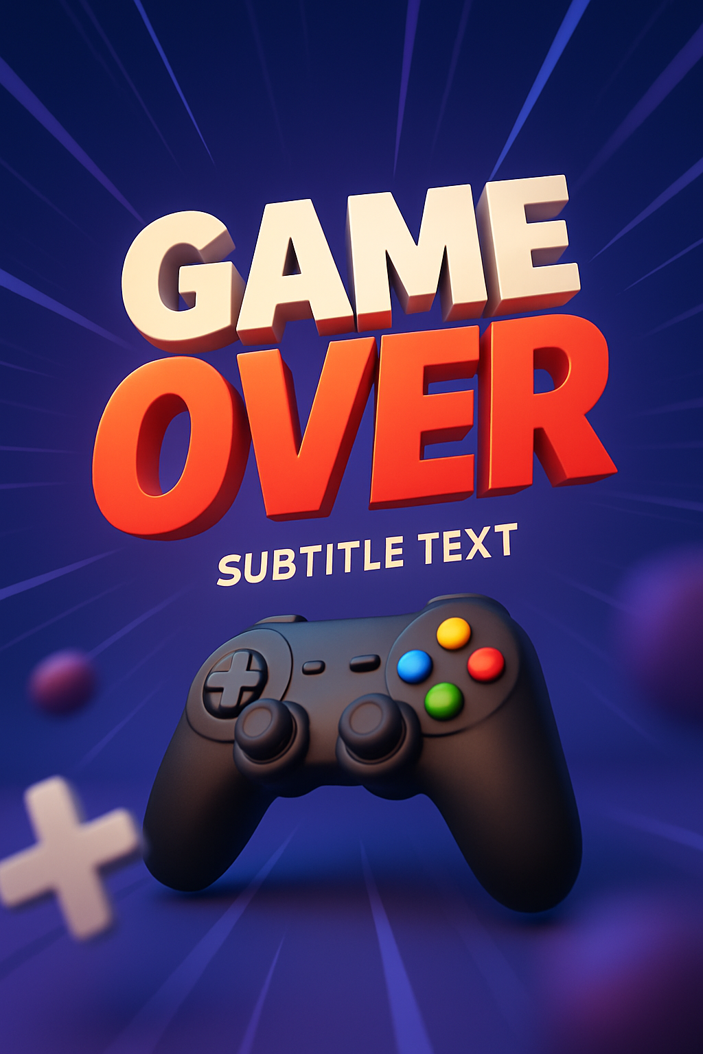 This is a vibrant 3D graphic featuring a 'Game Over' message and a game controller. It's designed for gaming-related content, suitable for social media or promotional materials.