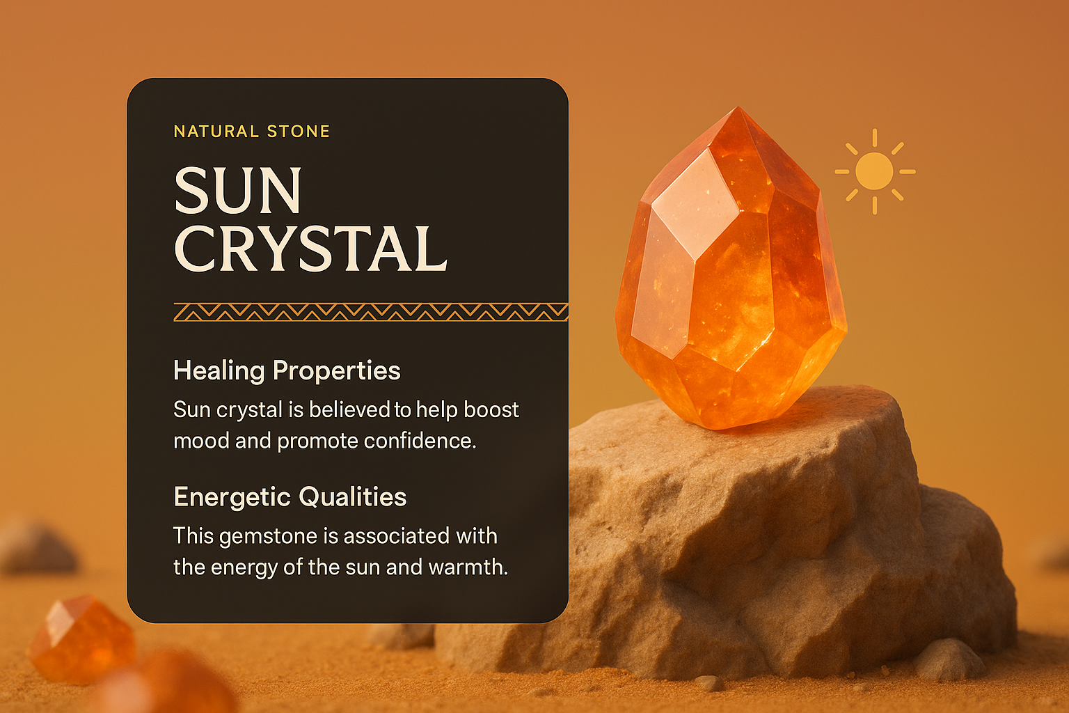 /Collection: /by davooda/Type: PNG/A captivating 3D illustration of a sun crystal set against a warm gradient background. The design integrates a dark informational panel detailing its healing properties and energetic qualities.