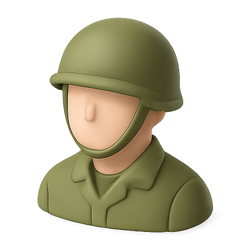 A 3D-rendered icon of a soldier with a helmet, showcasing a minimalist design. This graphic is ideal for military-themed projects or educational materials.