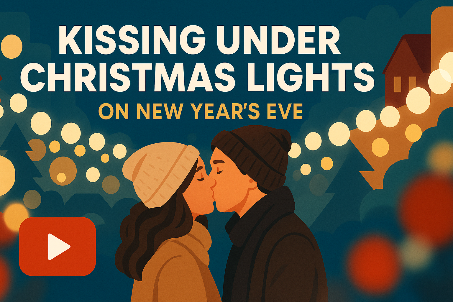 Romantic Illustration of a Couple Kissing Under Christmas Lights
