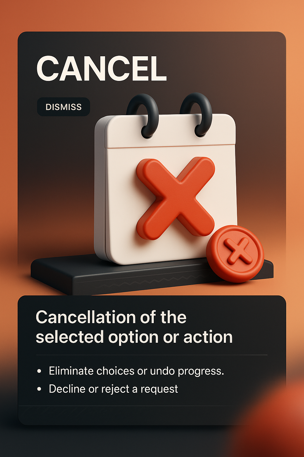 A modern 3D illustration featuring a calendar with a red cancel symbol and a button. The design includes a dark panel background, conveying a sleek and professional look.