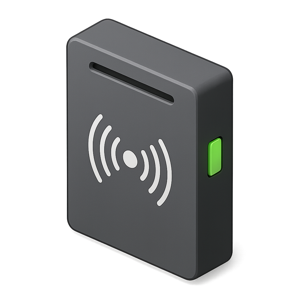 /Collection: /by davooda/Type: PNG/A sleek 3D access card reader icon depicted in a three-quarter isometric view. The reader features a slot and a green activation button, set against a transparent background.