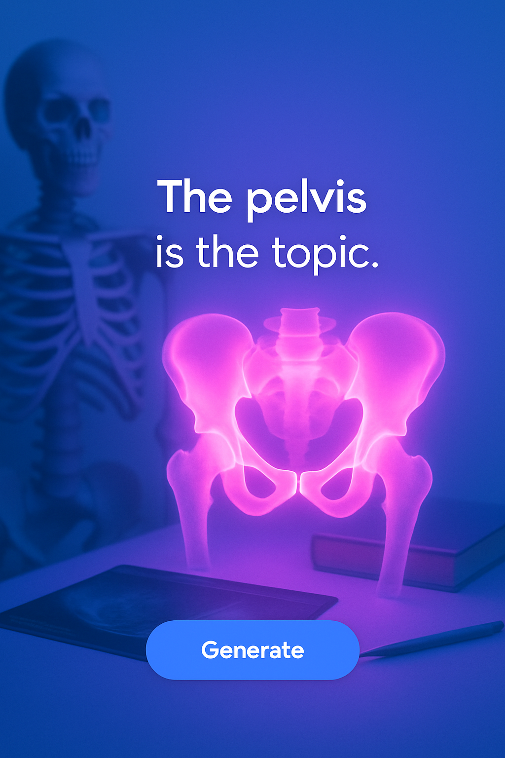 The image features a glowing neon-pink pelvis against a solid blue background, illuminating the surrounding space with cool hues. A skeleton figure and books are subtly integrated into the scene.