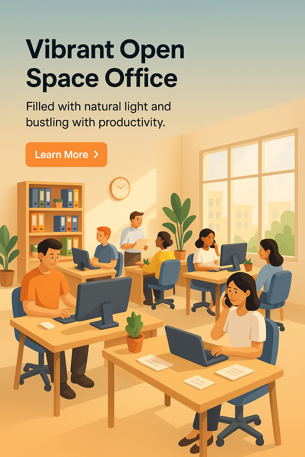 /Collection: /by davooda/Type: PNG/A vibrant illustration of an open space office filled with natural light, showcasing individuals engaged in productive work. The scene features modern desks, plants, and a warm color palette.