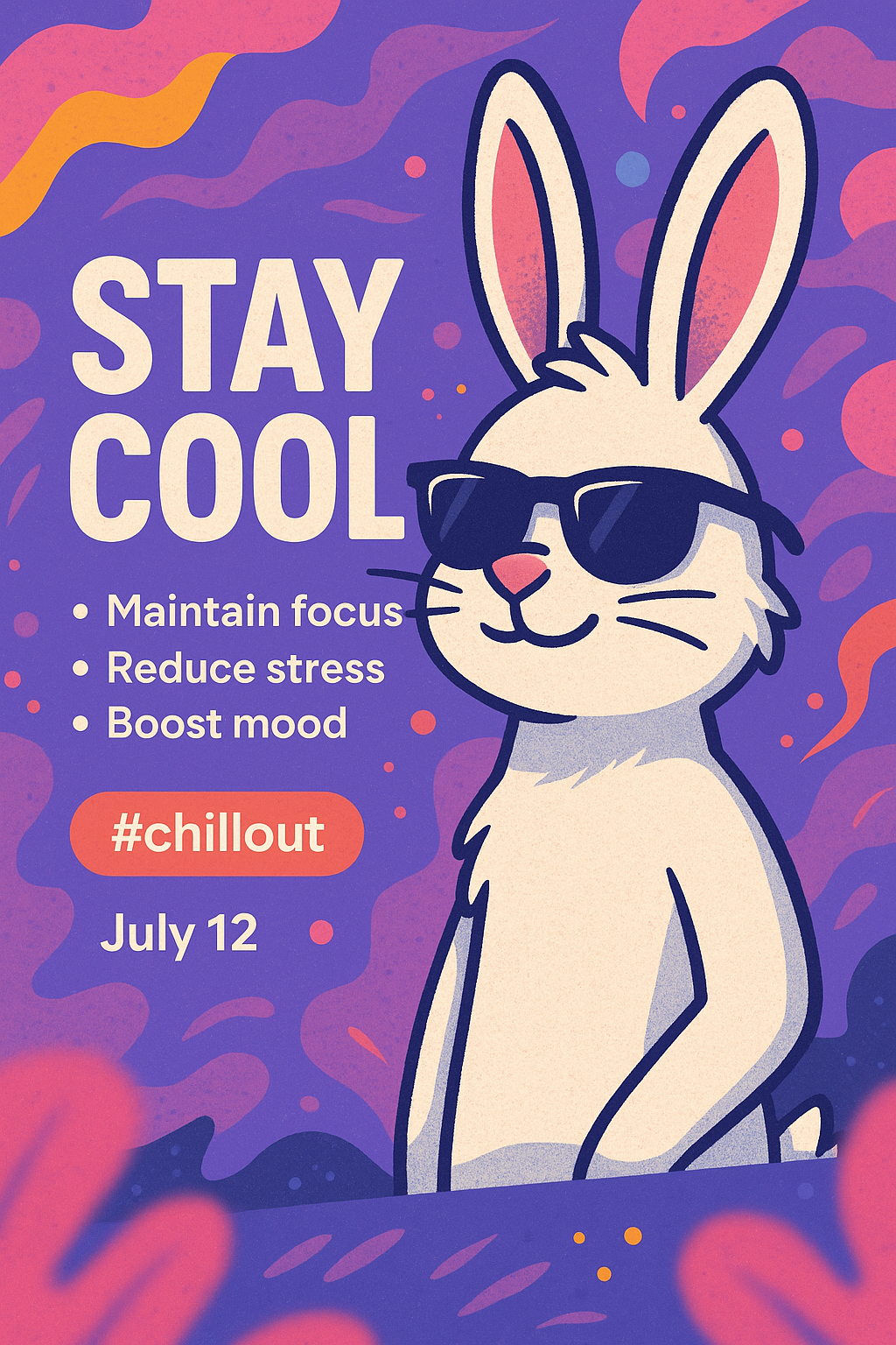 Vibrant social media graphic showcasing a cartoon bunny wearing sunglasses, promoting a chill-out theme with a colorful, abstract background, ideal for casual engagement.