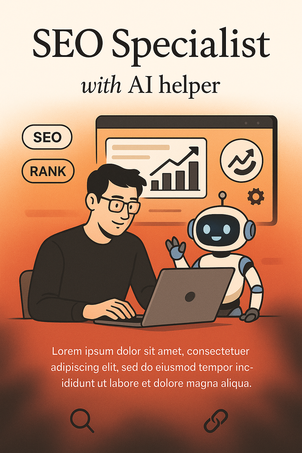 /Collection: /by davooda/Type: PNG/An illustration showcasing an SEO specialist working with an AI assistant. The scene features a stylish gradient background, engaging visuals, and thematic elements representing SEO tasks.