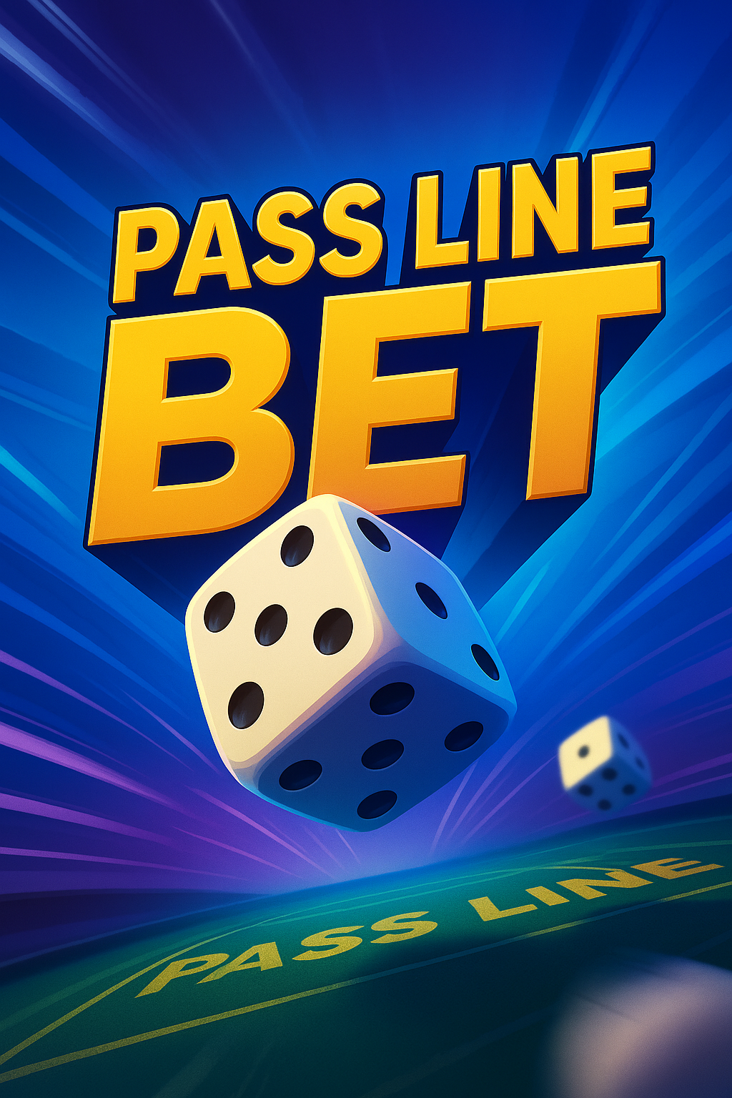 A vibrant 3D graphic featuring the words 'PASS LINE BET' prominently displayed, with dice in motion. The background has a smooth gradient, enhancing the dynamic feel.