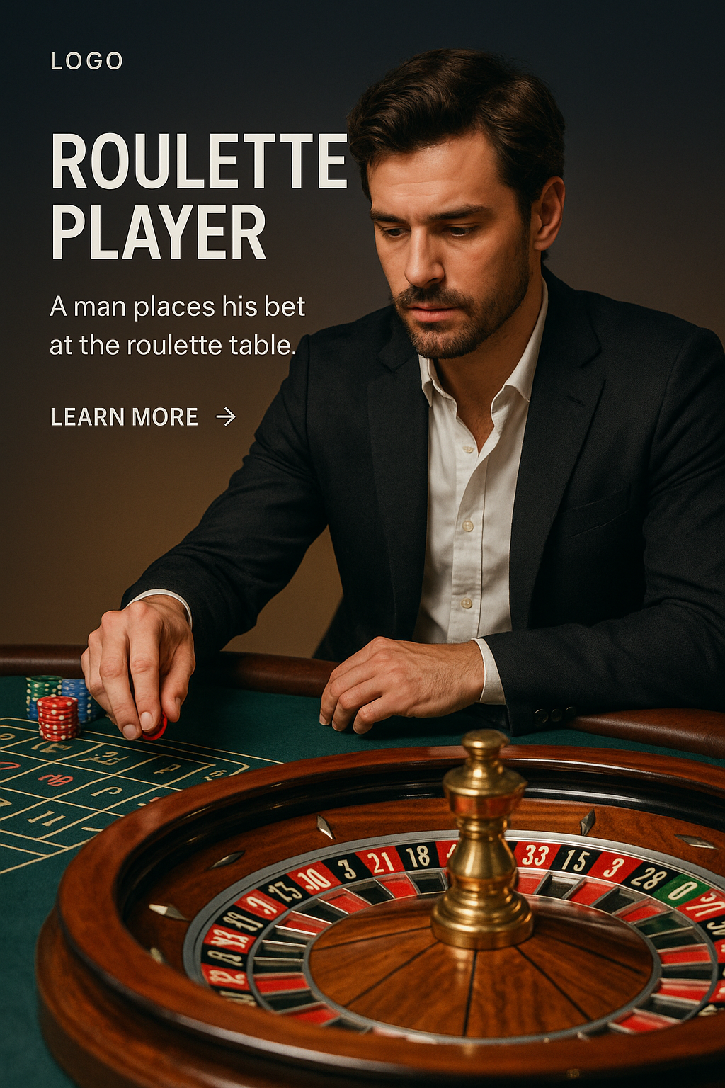 A focused man in a suit places his bet at a roulette table, with a gradient background. The composition highlights the elegance of casino gaming.