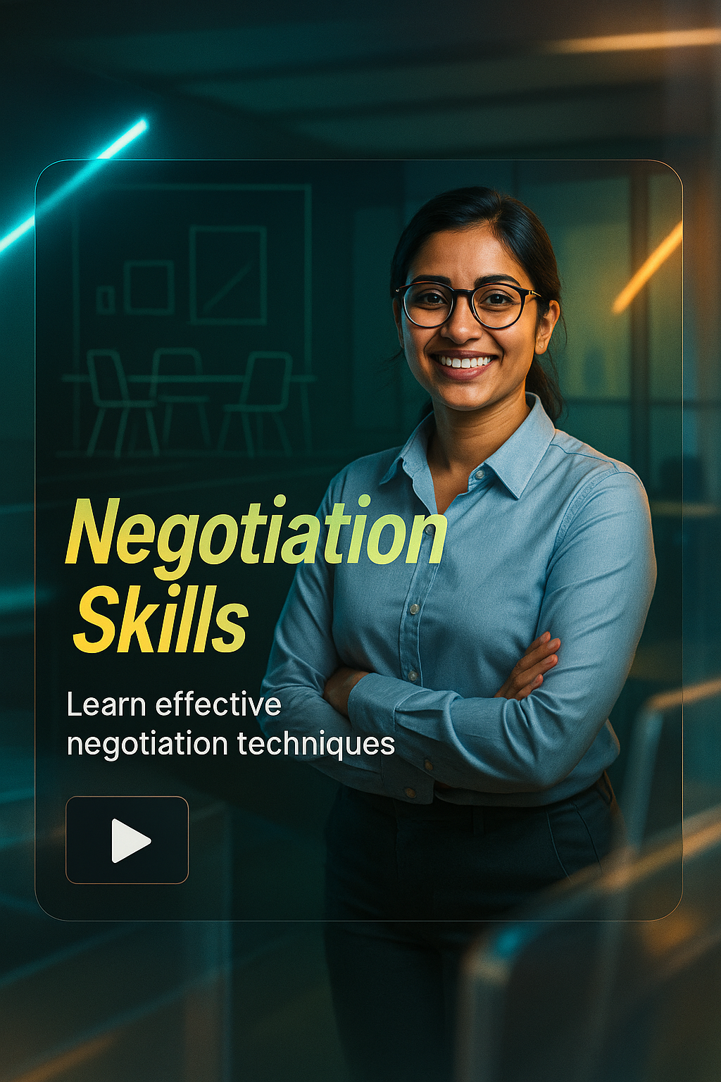 A promotional graphic showcasing negotiation skills training with a professional individual, modern design elements, suitable for educational content.