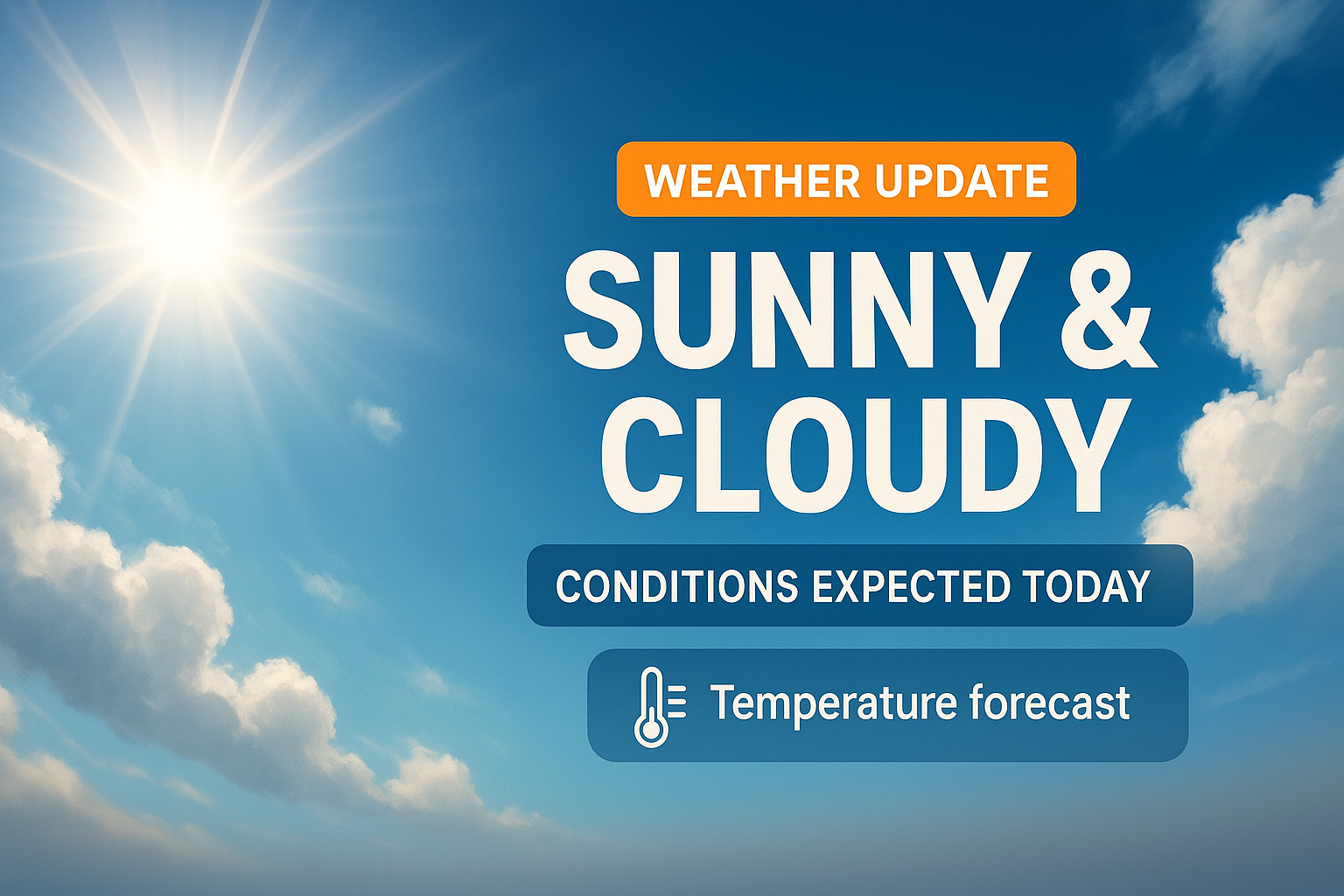 Informative weather update graphic showcasing sunny and cloudy conditions with a vibrant sky background. Ideal for social media or news platforms.