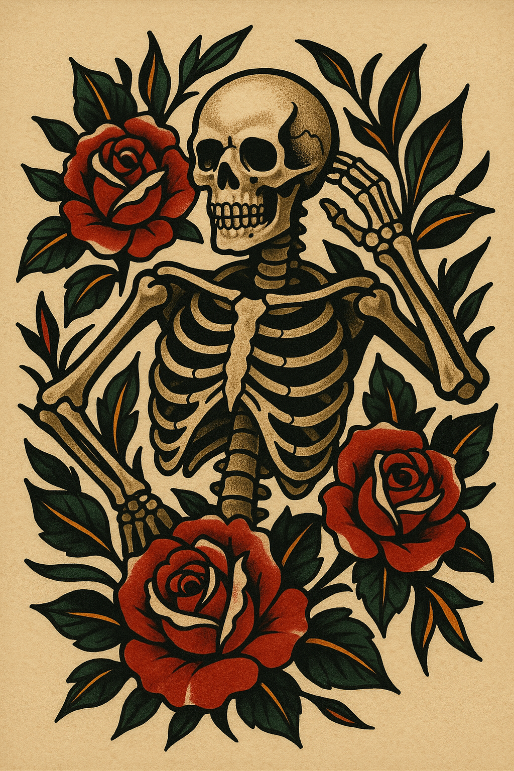 /Collection: /by davooda/Type: PNG/This image features a detailed illustration of a skeleton amidst vibrant red roses and green foliage, embodying themes of life and death. Ideal for art prints or tattoo designs.