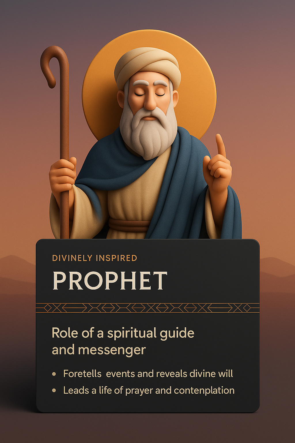 /Collection: /by davooda/Type: PNG/A visually striking 3D illustration of a prophet, featuring a smooth gradient background and integrated design elements like a dark panel with text. The artwork emphasizes the spiritual theme.