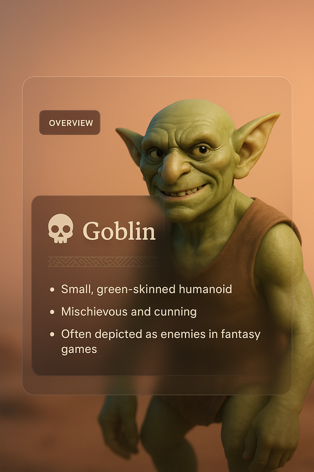A 3D goblin character with green skin is displayed against a smooth gradient background. The illustration features an informative overlay with an overview of the goblin, enhancing the design.