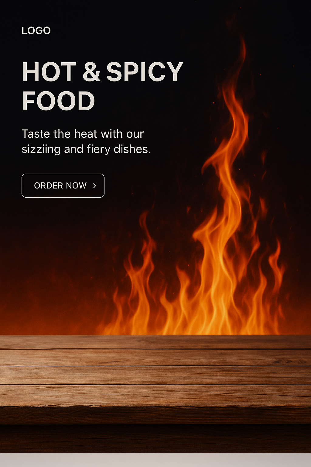 /Collection: /by davooda/Type: PNG/An empty wooden table in the foreground with a vibrant fire background, designed for hot and spicy food promotion. The layout features a logo, a bold heading, and an action button to entice customers.