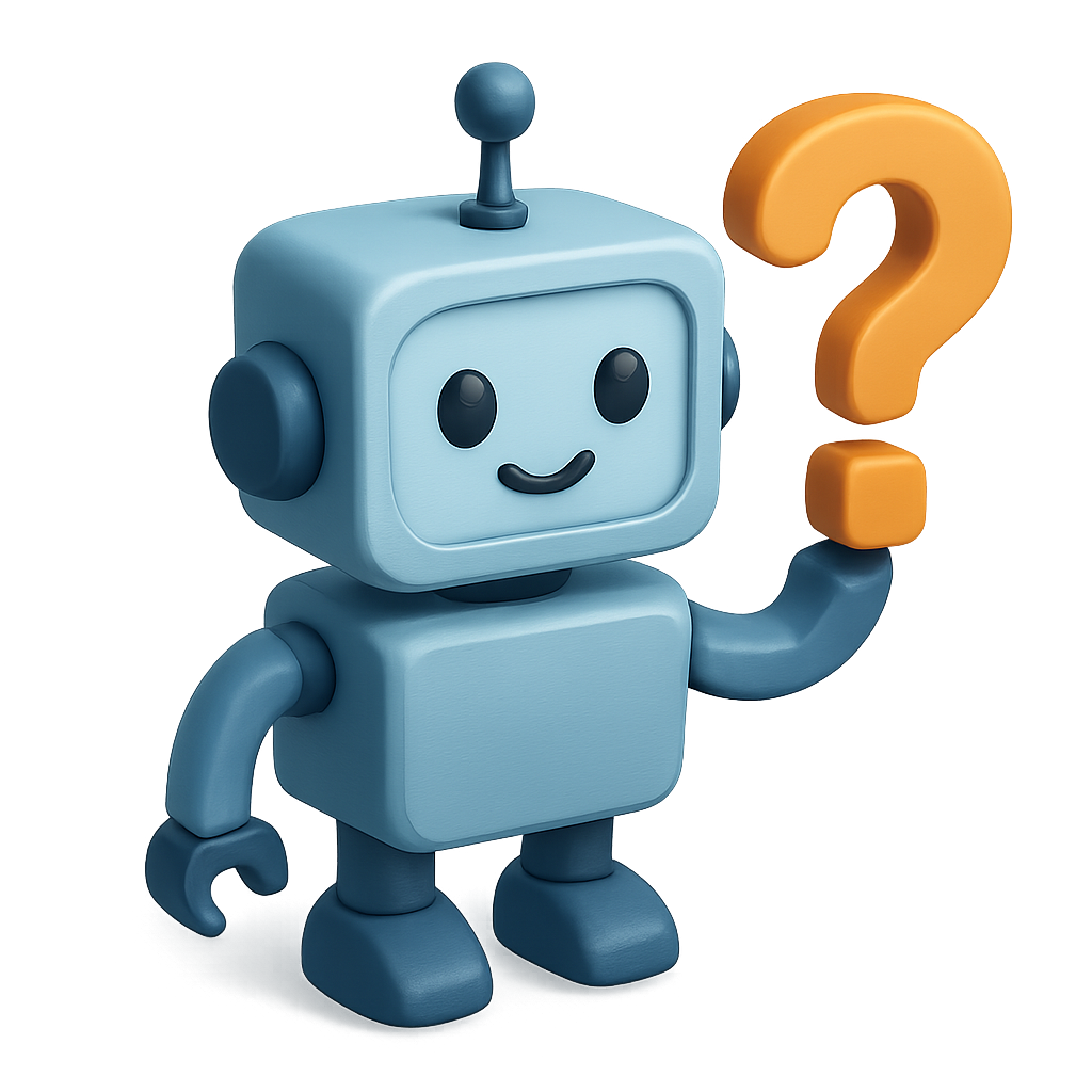 /Collection: /by davooda/Type: PNG/A stylized 3D robot character with a cheerful expression, holding an orange question mark. The design features a transparent background and is presented in a three-quarter isometric view.