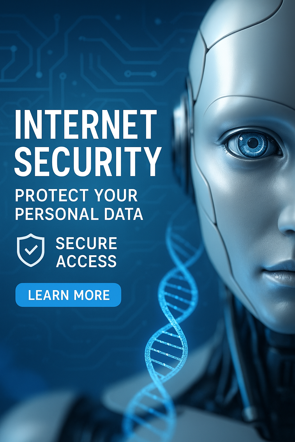 /Collection: /by davooda/Type: PNG/A visually striking graphic representing internet security, featuring a robotic figure against a blue digital background. Ideal for tech-related content emphasizing data protection.