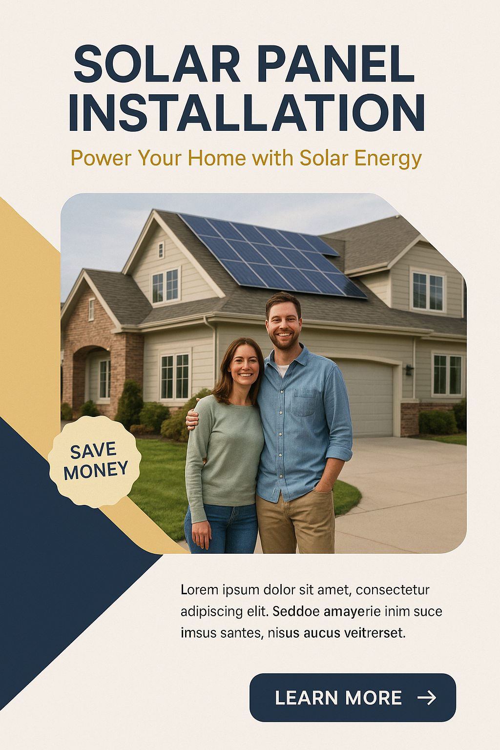 /Collection: /by davooda/Type: PNG/A cheerful couple stands in front of their large house showcasing solar panels. The design features a clear hierarchy, balanced composition, and engaging aesthetics.