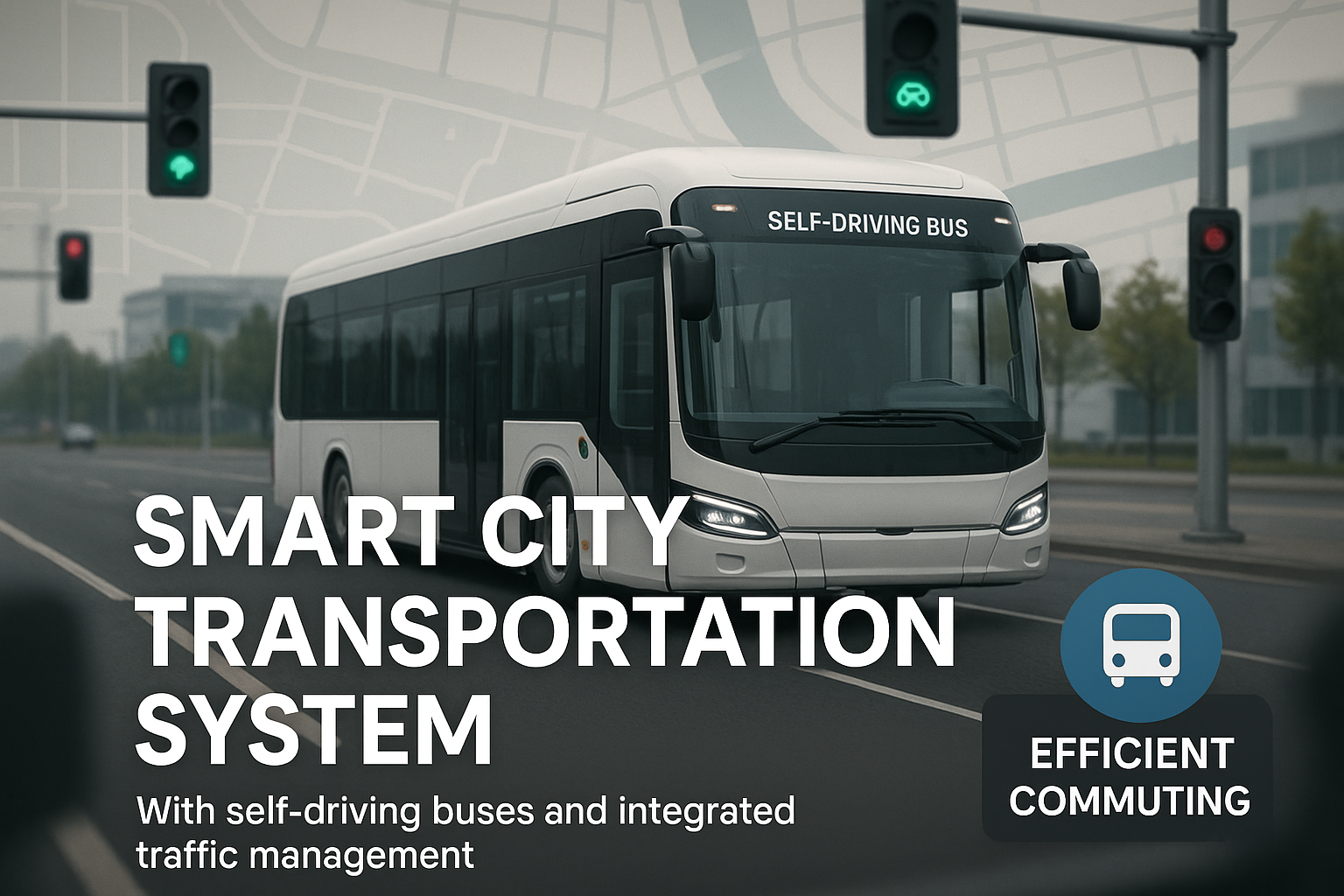 /Collection: /by davooda/Type: PNG/A modern digital illustration showcasing a self-driving bus in a smart city environment, emphasizing efficient commuting and advanced traffic management systems. Ideal for urban planning or technology-related presentations.