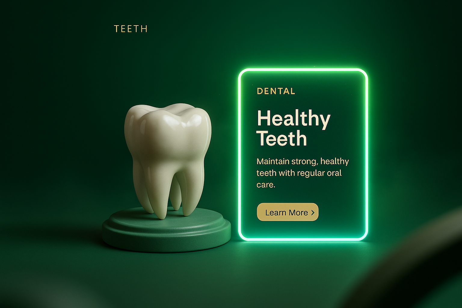 /Collection: /by davooda/Type: PNG/A detailed 3D scene showcasing a stylized tooth on a pedestal against a dark gradient background. Neon accents illuminate a text block promoting dental health.