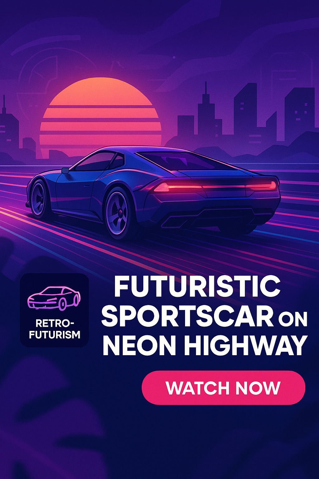 /Collection: /by davooda/Type: PNG/Vibrant digital artwork featuring a futuristic sports car driving on a neon-lit highway, ideal for tech and automotive promotions, with a retro-futuristic aesthetic.