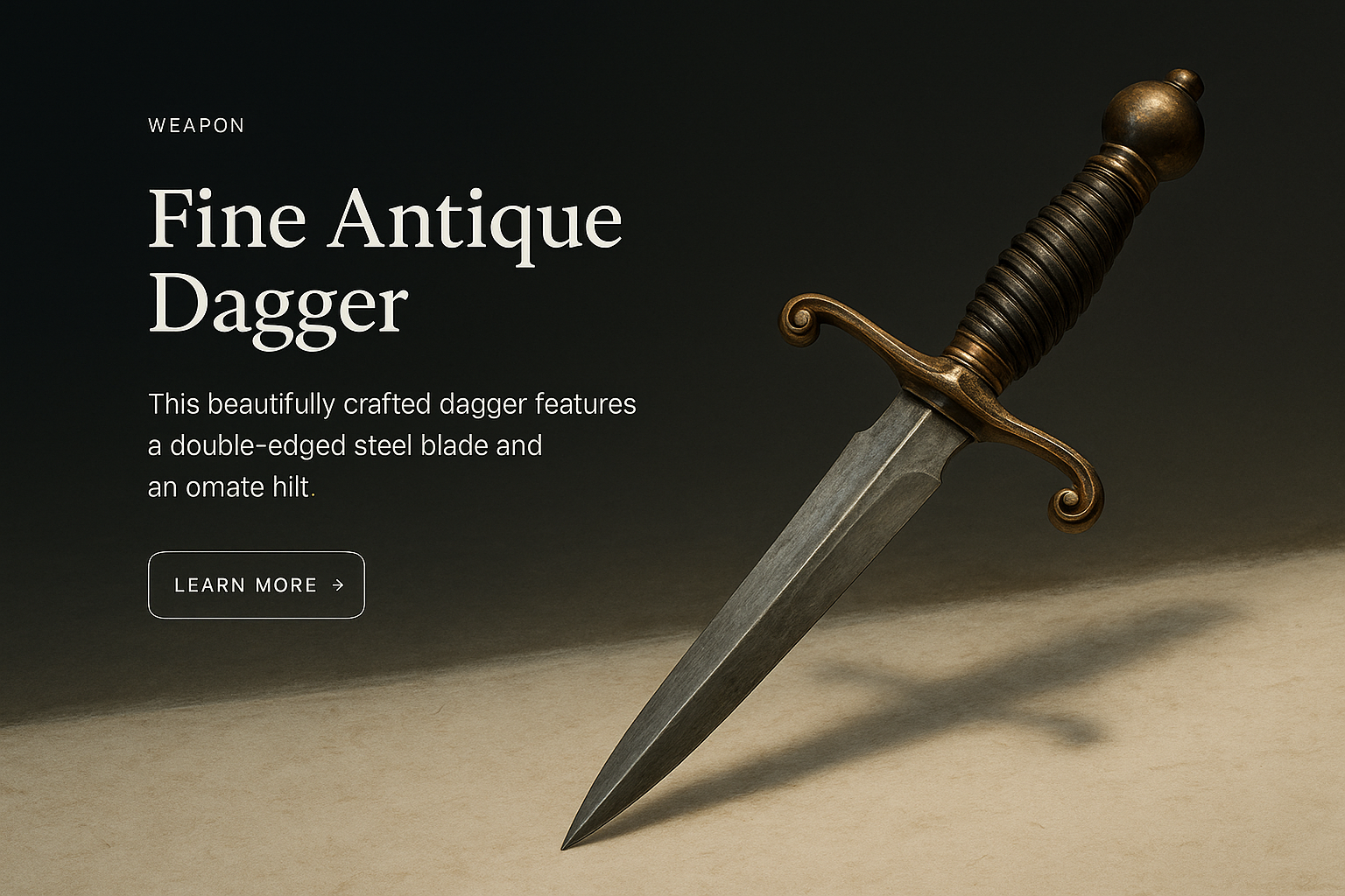 /Collection: /by davooda/Type: PNG/A visually engaging web design showcasing a fine antique dagger with a double-edged steel blade. The design includes a small label, header, text block, and action button.