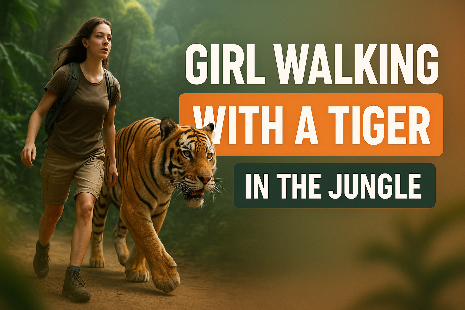 Adventure Scene Featuring a Girl Walking with a Tiger in a Jungle