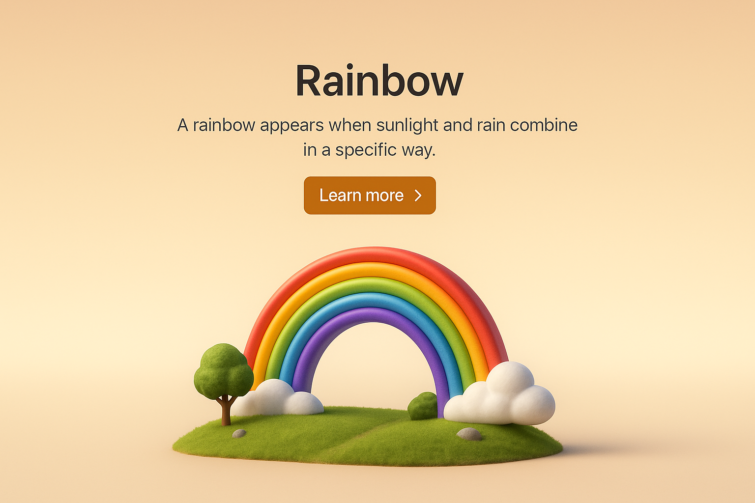 A vibrant 3D depiction of a rainbow arching over a grassy hill, with soft clouds and stylized trees. Text and a button overlay enhance the scene.