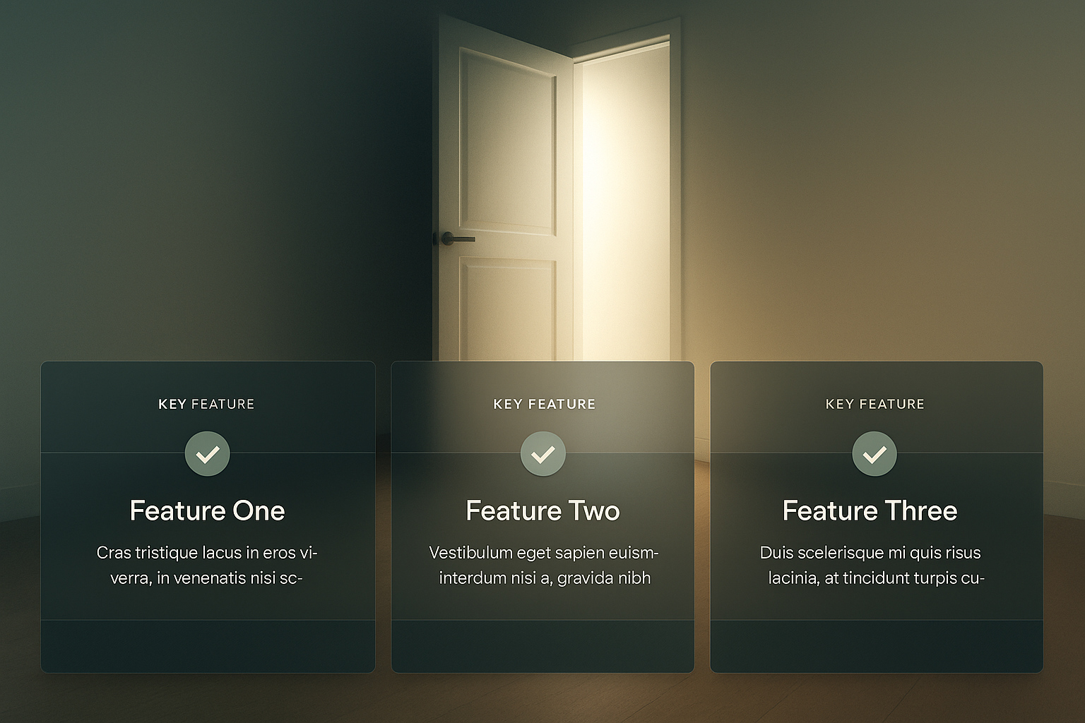 An inviting, slightly open door emits bright light, complemented by three feature blocks below. The layout is harmonious, with a soft gradient background enhancing readability.