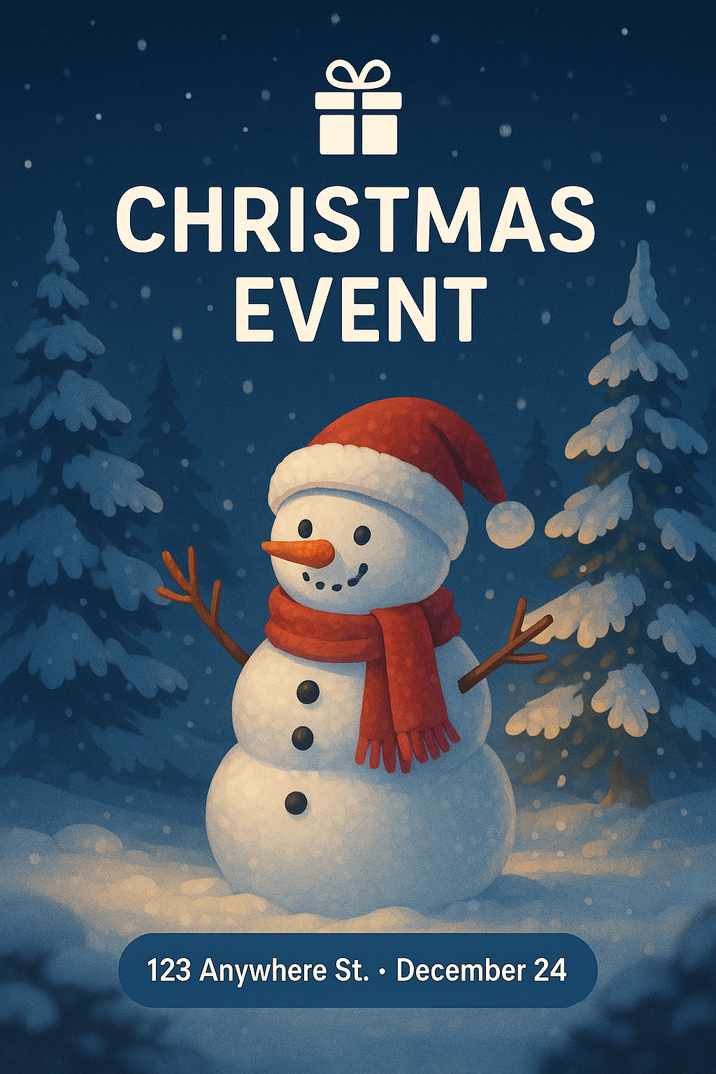Festive Christmas Event Poster Featuring Snowman and Winter Landscape