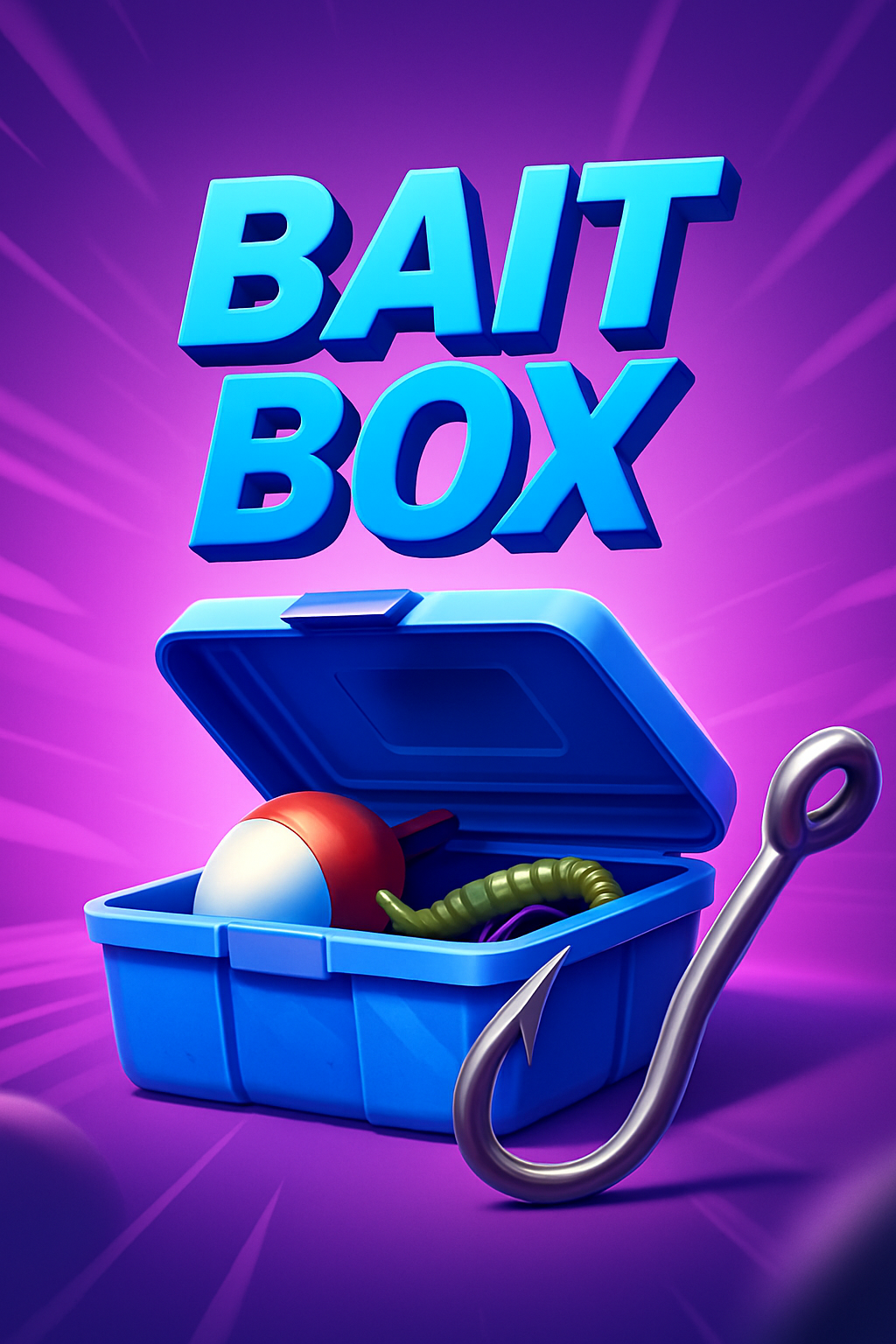 /Collection: /by davooda/Type: PNG/A vibrant 3D illustration of a bait box, featuring a colorful bobber and a fishing hook. The dynamic background enhances the visual impact with smooth gradients and radiating lines.