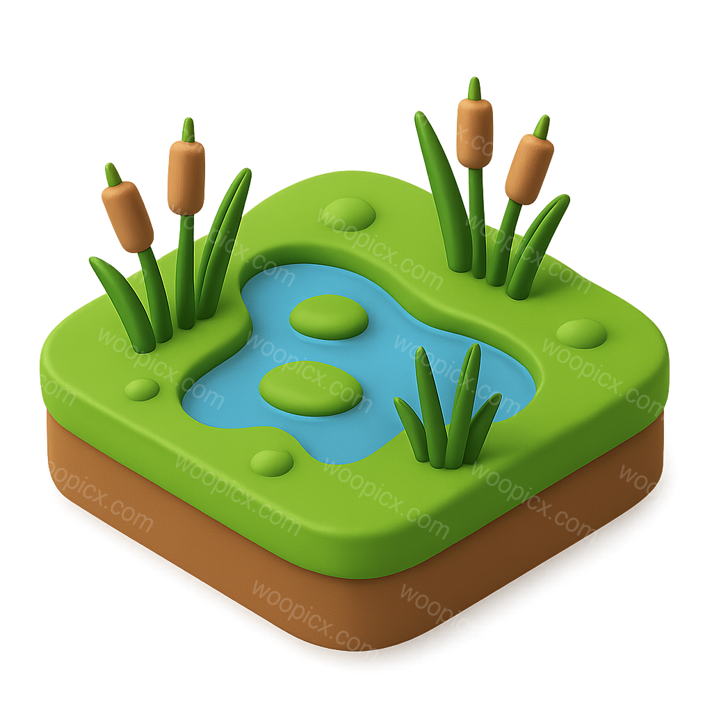 /Premium/Collection: /by davooda/Type: PNG/A vibrant 3D icon representing a bog scene with green grass, water elements, and cattail plants. The design features a three-quarter view, emphasizing a volumetric and isometric style.