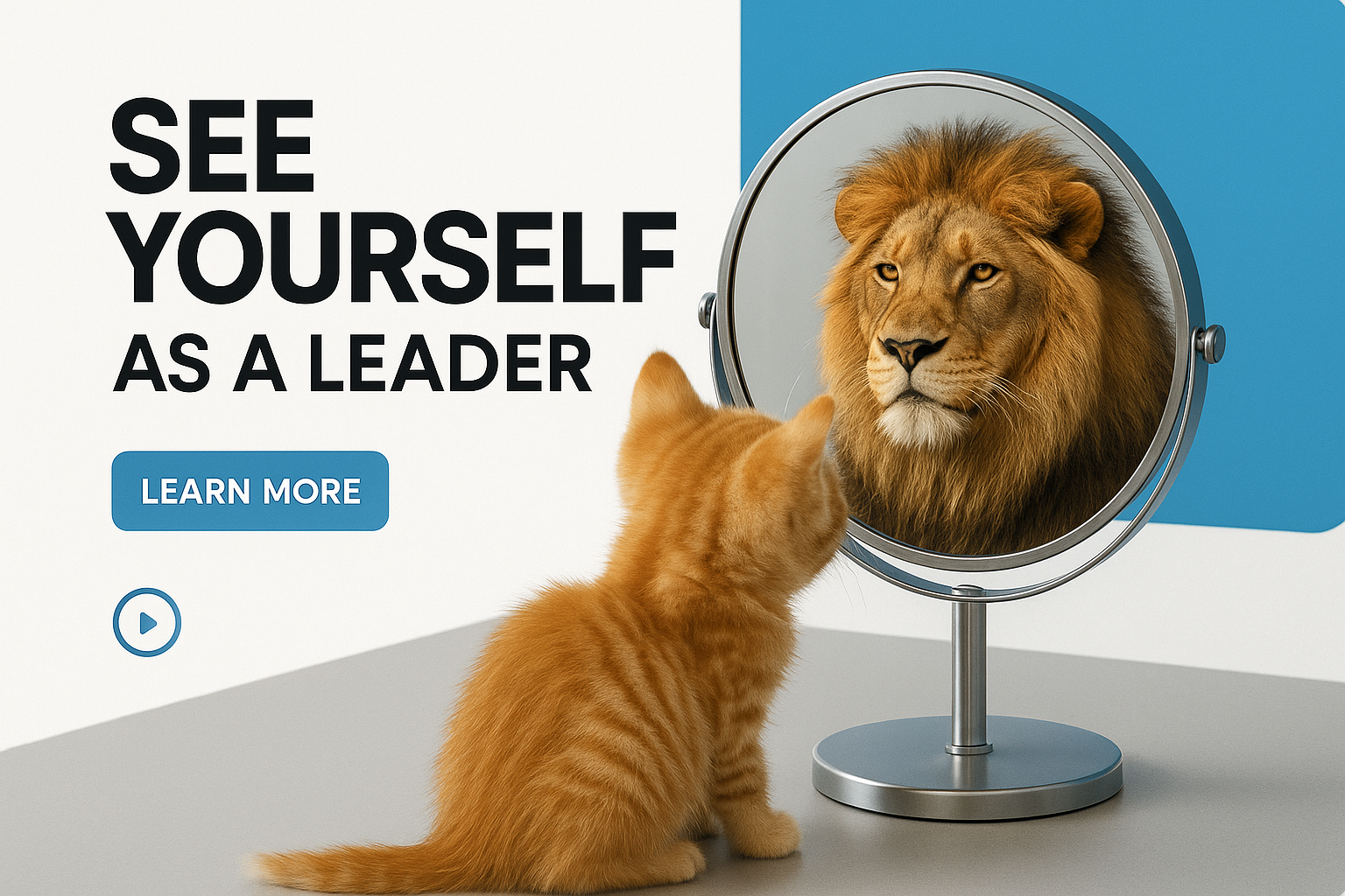A close-up of a kitten admiring its reflection of a lion in a round mirror on a table. The image features a clean, modern corporate style with bold typography and a bright, geometric background.