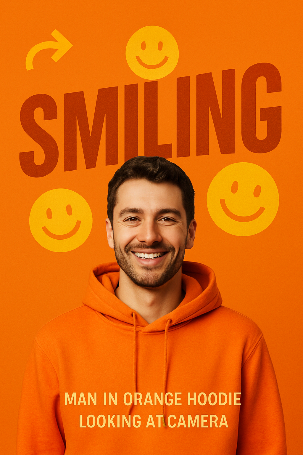/Collection: /by davooda/Type: PNG/Vibrant portrait of a man in an orange hoodie, exuding happiness against a bright orange background with smiley face graphics, perfect for social media or marketing.