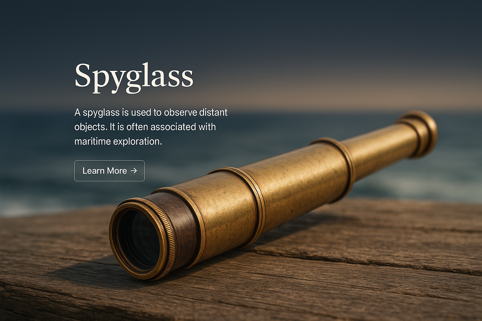 A beautifully crafted spyglass resting on a wooden surface, overlooking a serene ocean view. The image features a subtle gradient background enhancing the elegance of the spyglass.