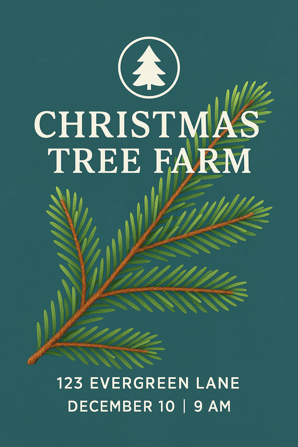 Charming promotional poster featuring a pine branch design for a Christmas tree farm event. Ideal for holiday marketing and local community engagement.