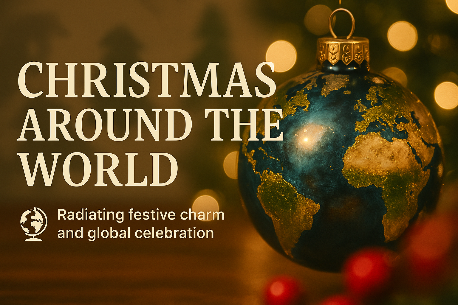 A visually appealing graphic featuring a globe-shaped ornament symbolizing Christmas celebrations worldwide, ideal for holiday marketing and festive promotions.