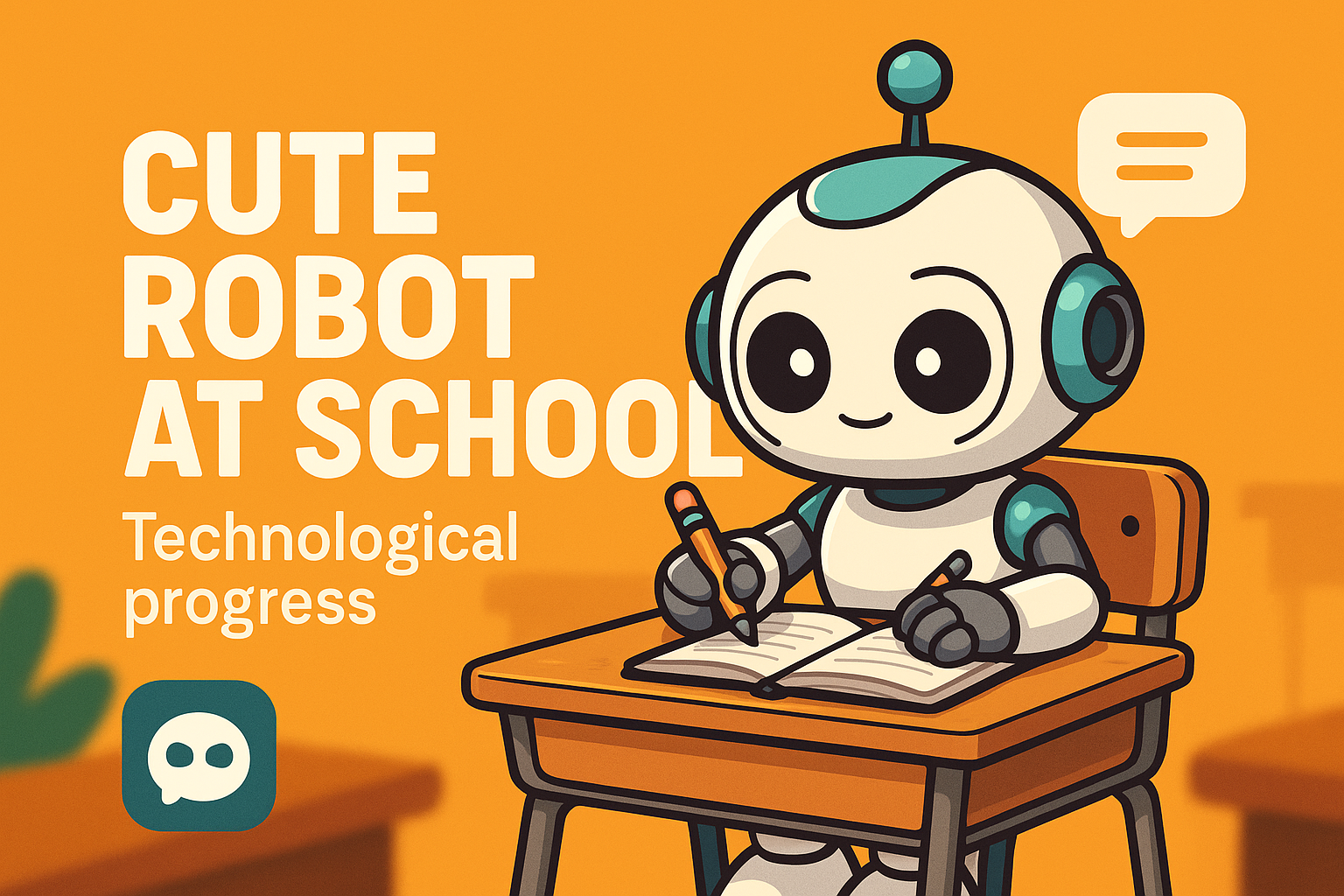 Whimsical illustration of a cute robot sitting at a school desk, engaging in writing. Ideal for educational content or technology-themed projects targeted at young audiences.