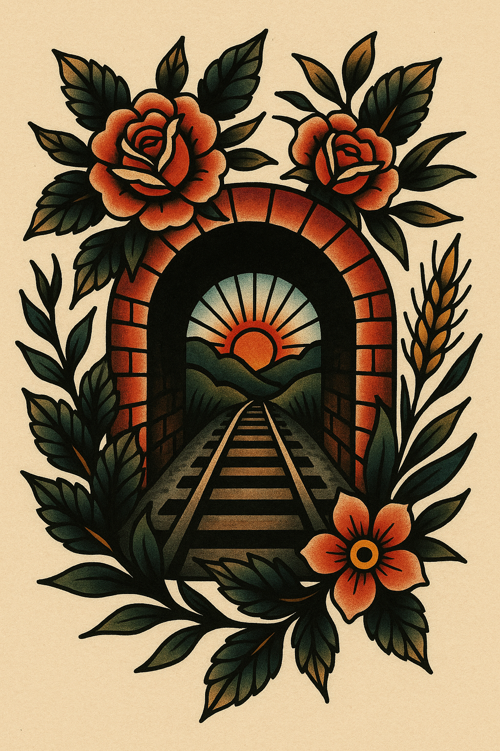 /Collection: /by davooda/Type: PNG/This is a vibrant tattoo design featuring a tunnel framed by roses, with a sunset and railway tracks inside. It combines floral and landscape elements, appealing to tattoo enthusiasts.