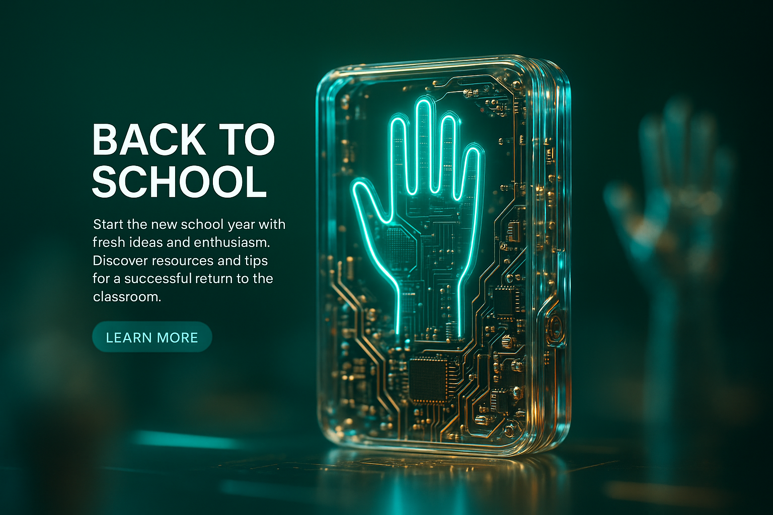 A futuristic classroom scene featuring a glowing hand illustration, symbolizing engagement. The image showcases a blend of neon accents and high-tech elements, creating an inviting atmosphere for learning.