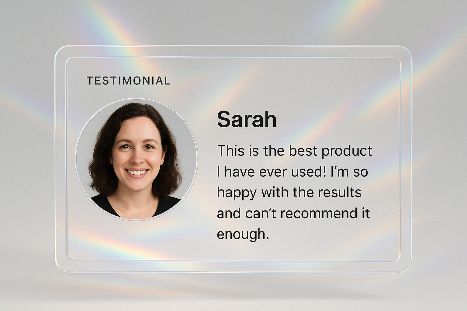 /Collection: /by davooda/Type: PNG/A modern testimonial block featuring a circular photo, name, and testimonial text with a rainbow prism effect on a light gray background, showcasing a sleek design.