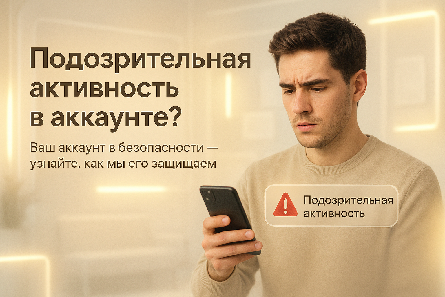 Informative graphic designed to alert users about suspicious activity in their accounts. Features a concerned individual checking their phone, conveying urgency and attention to account security.