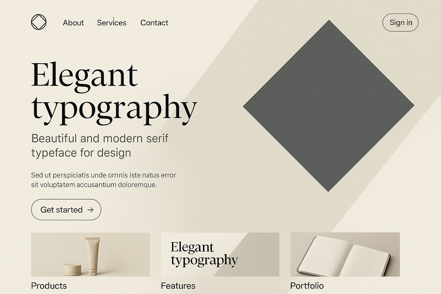 /Collection: /by davooda/Type: PNG/A sophisticated landing page design featuring elegant typography. The layout includes sections for products, features, and a portfolio, complemented by geometric shapes.