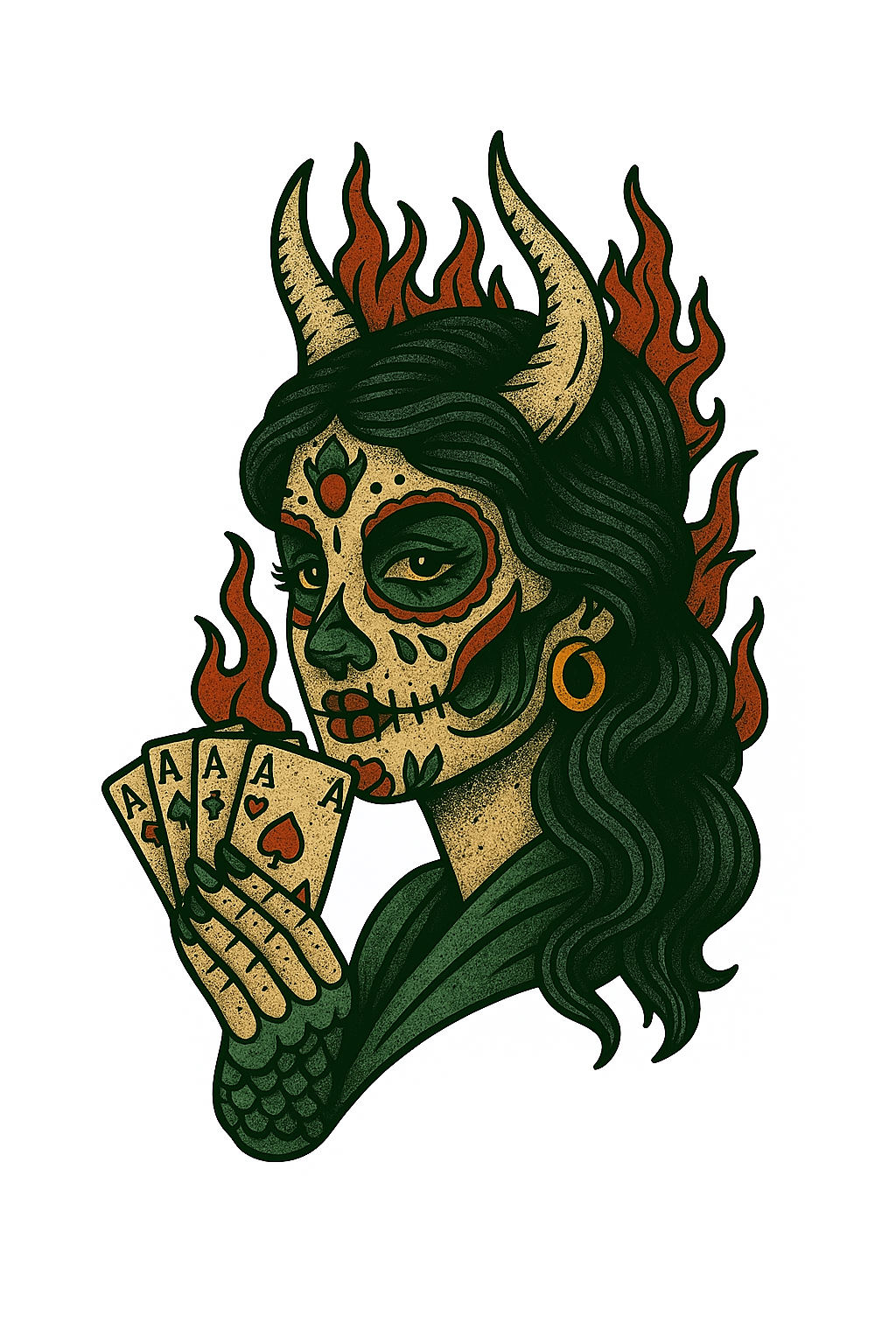 Illustrative Graphic of a Skull Woman Holding Playing Cards