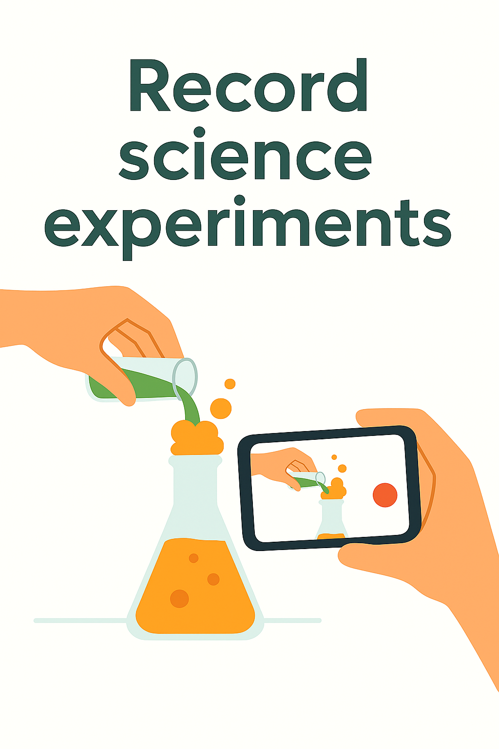 A vibrant and engaging graphic illustrating the process of recording science experiments. Perfect for educational materials or science-related content.