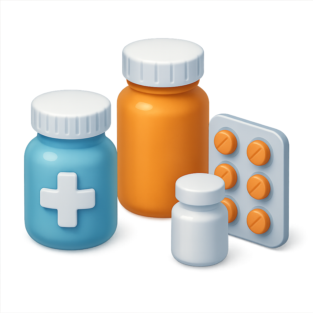 A visually appealing 3D representation of medicine bottles in various colors, including blue, orange, and white, alongside a pill container, all designed with an isometric view.