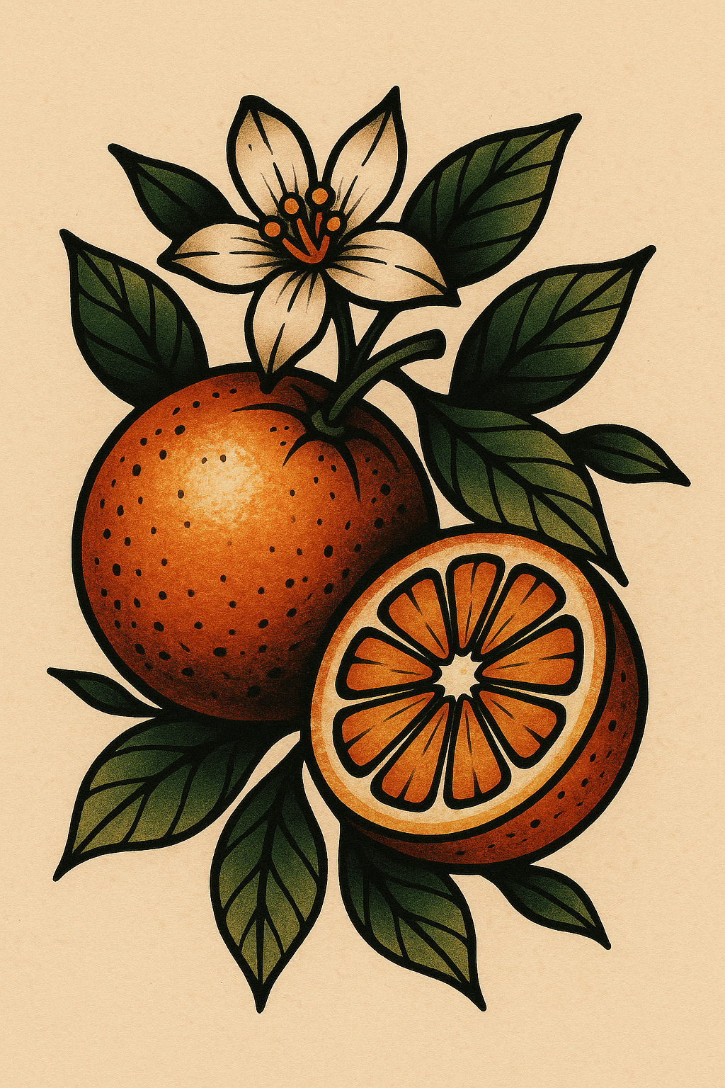 /Collection: /by davooda/Type: PNG/A vibrant, stylized illustration featuring whole and sliced oranges, surrounded by leaves and a flower. This botanical art is perfect for use in food-related designs or branding.